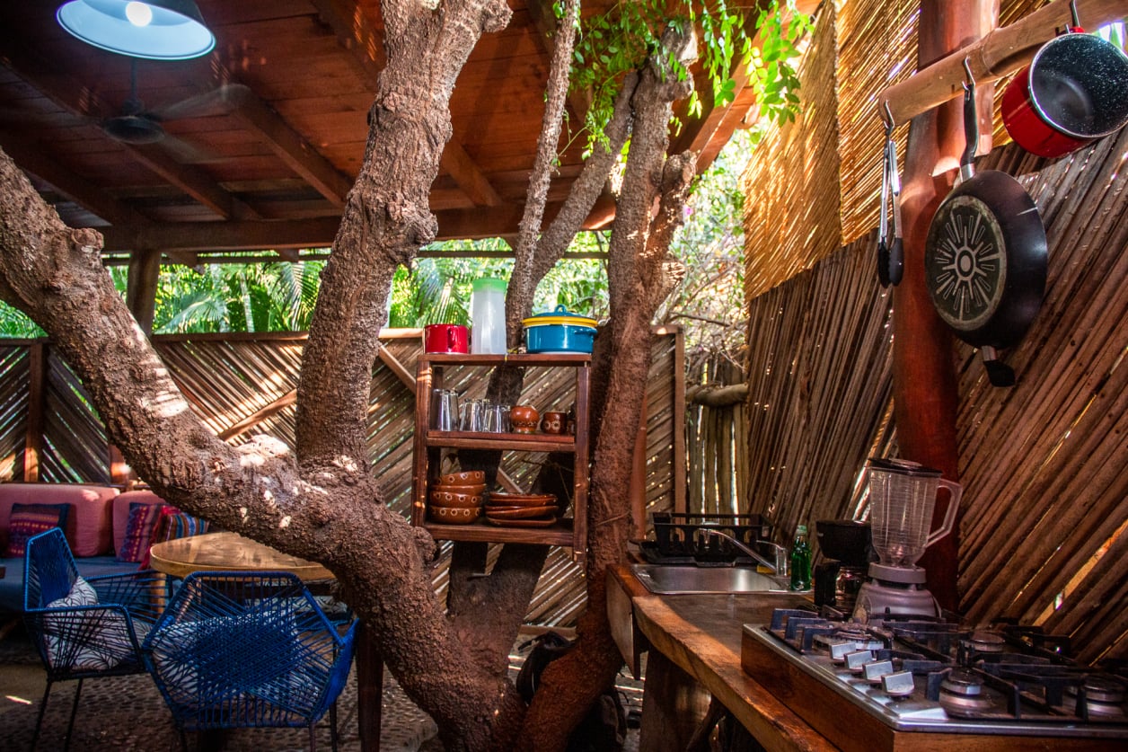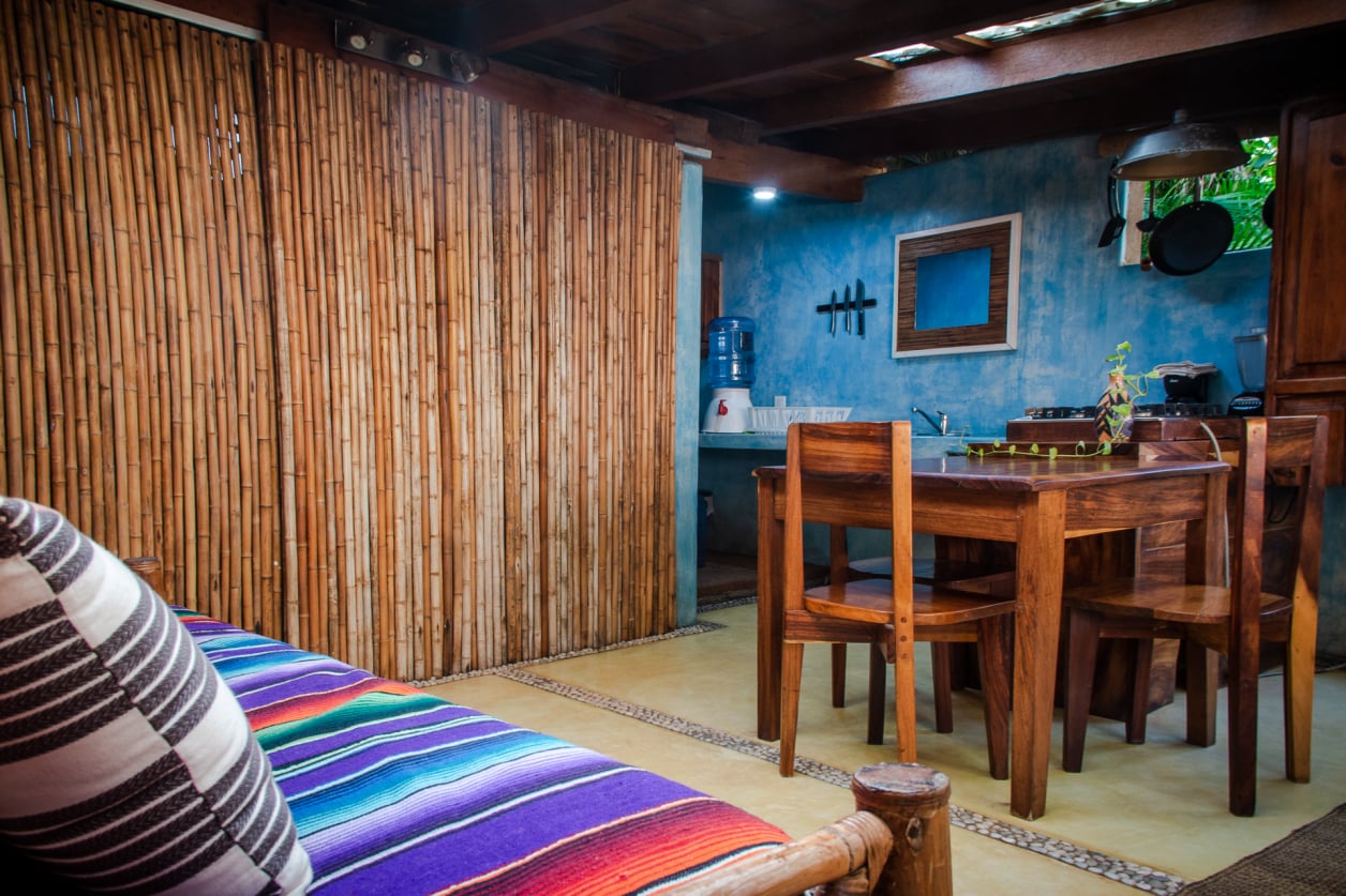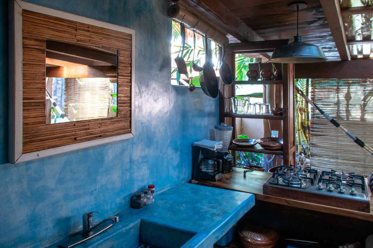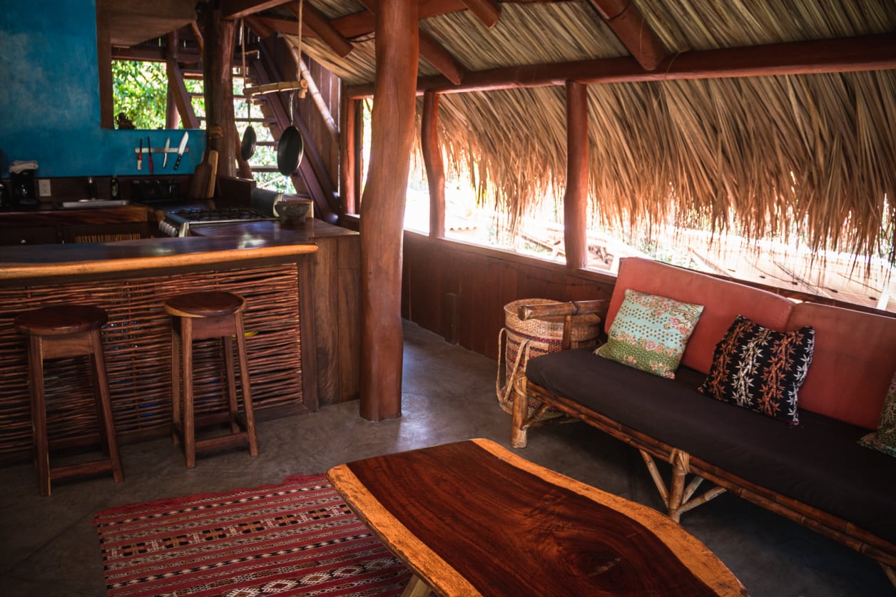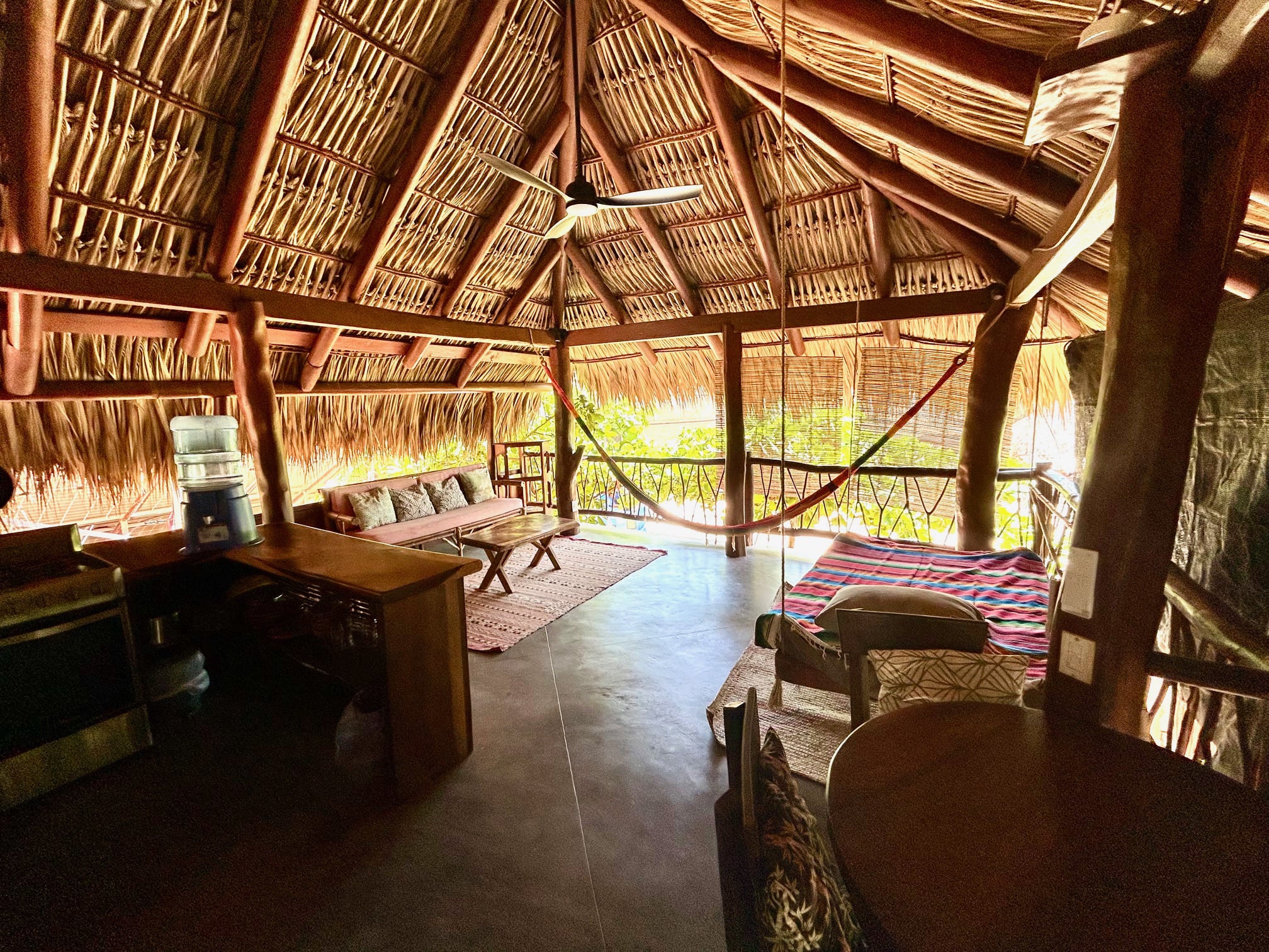 Queen bed in the breezy treetop palapita. Living room, with full kitchen and hanging bed. Large open air bathroom and a hammock.