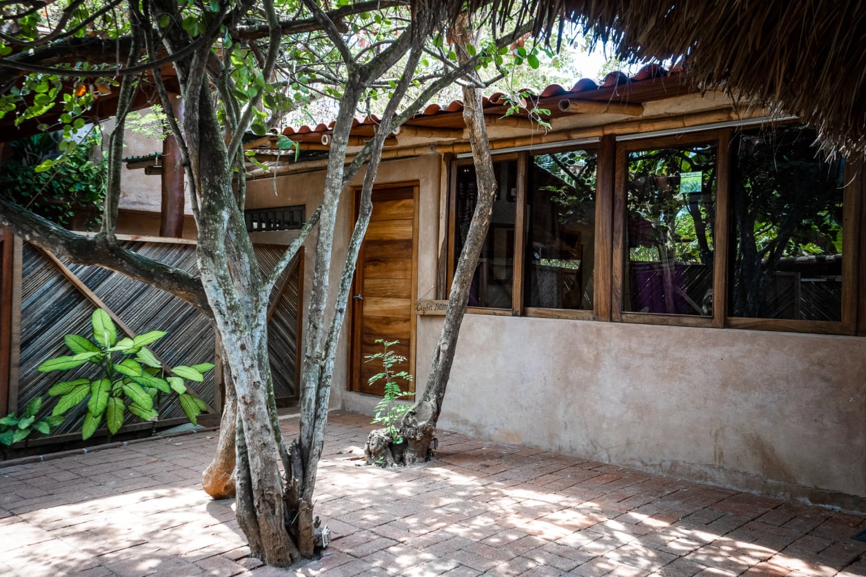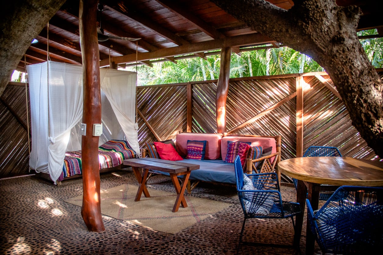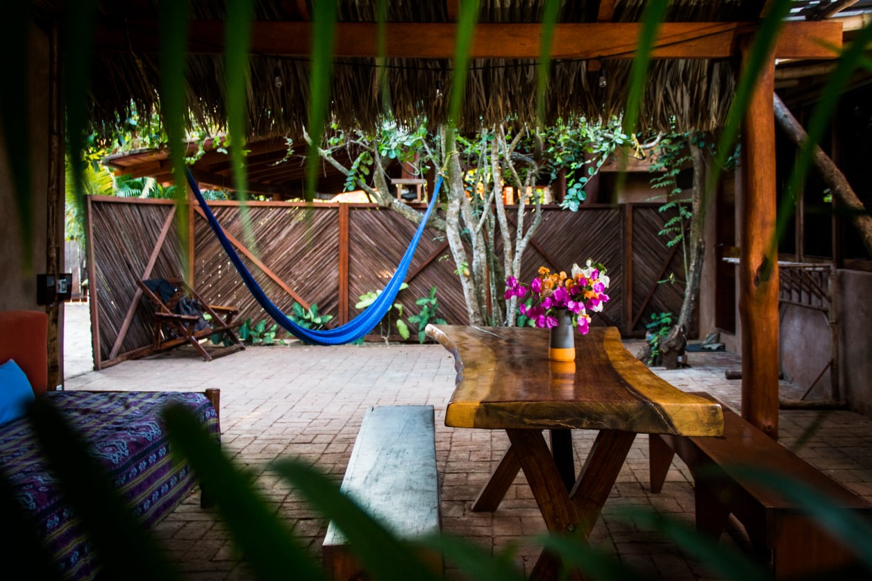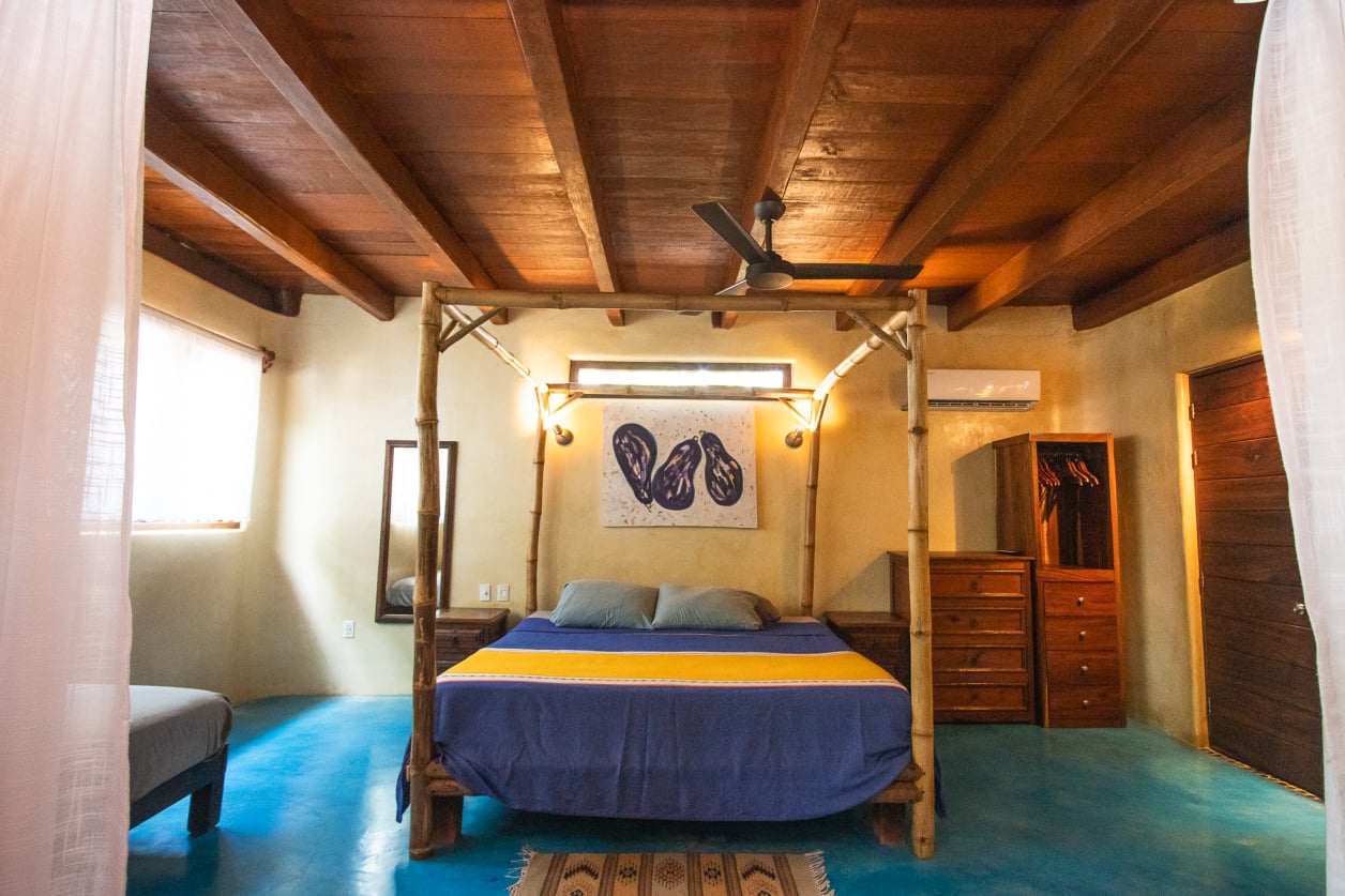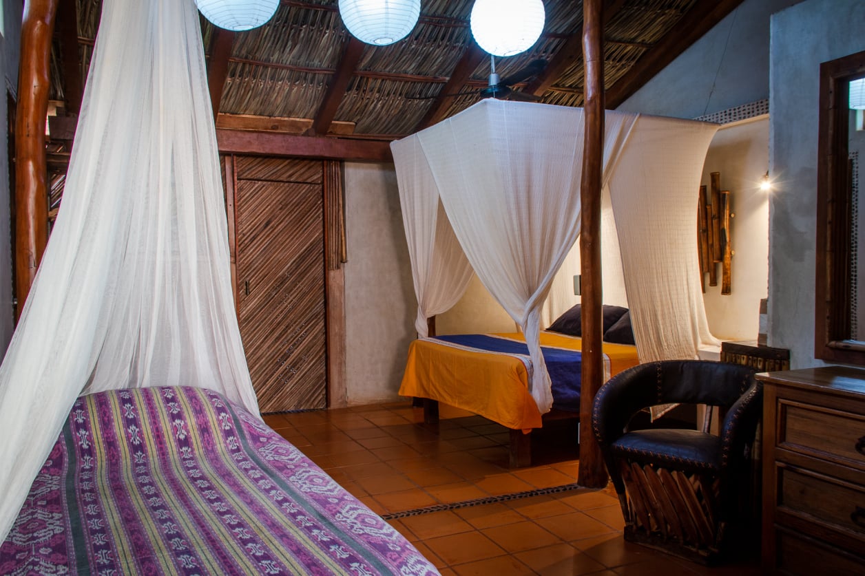 Queen bed in the breezy treetop palapita. Living room, with full kitchen and hanging bed. Large open air bathroom and a hammock.