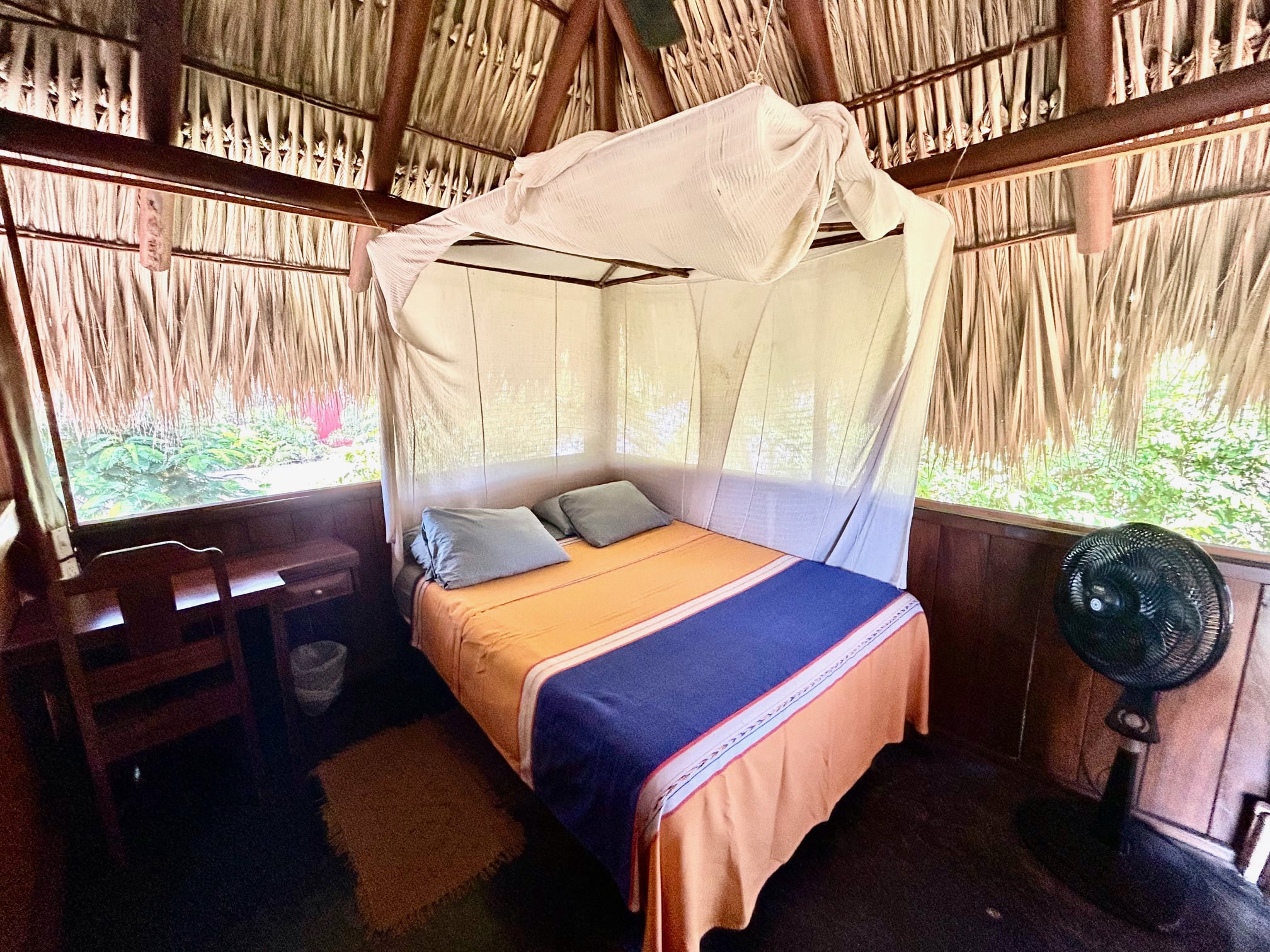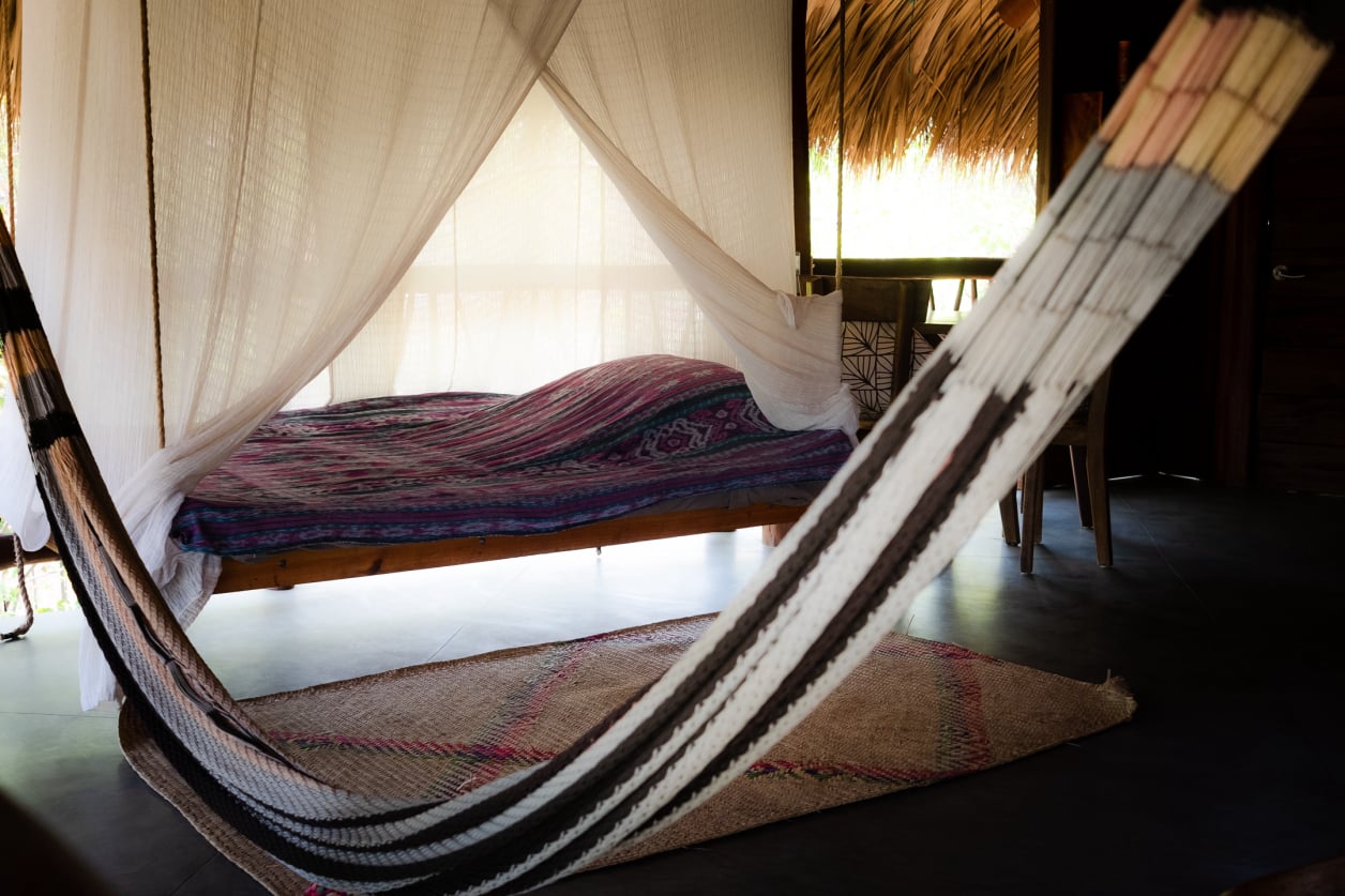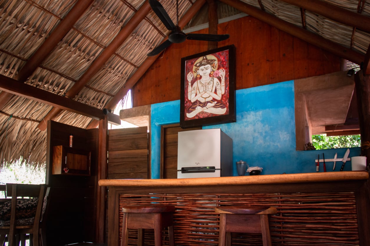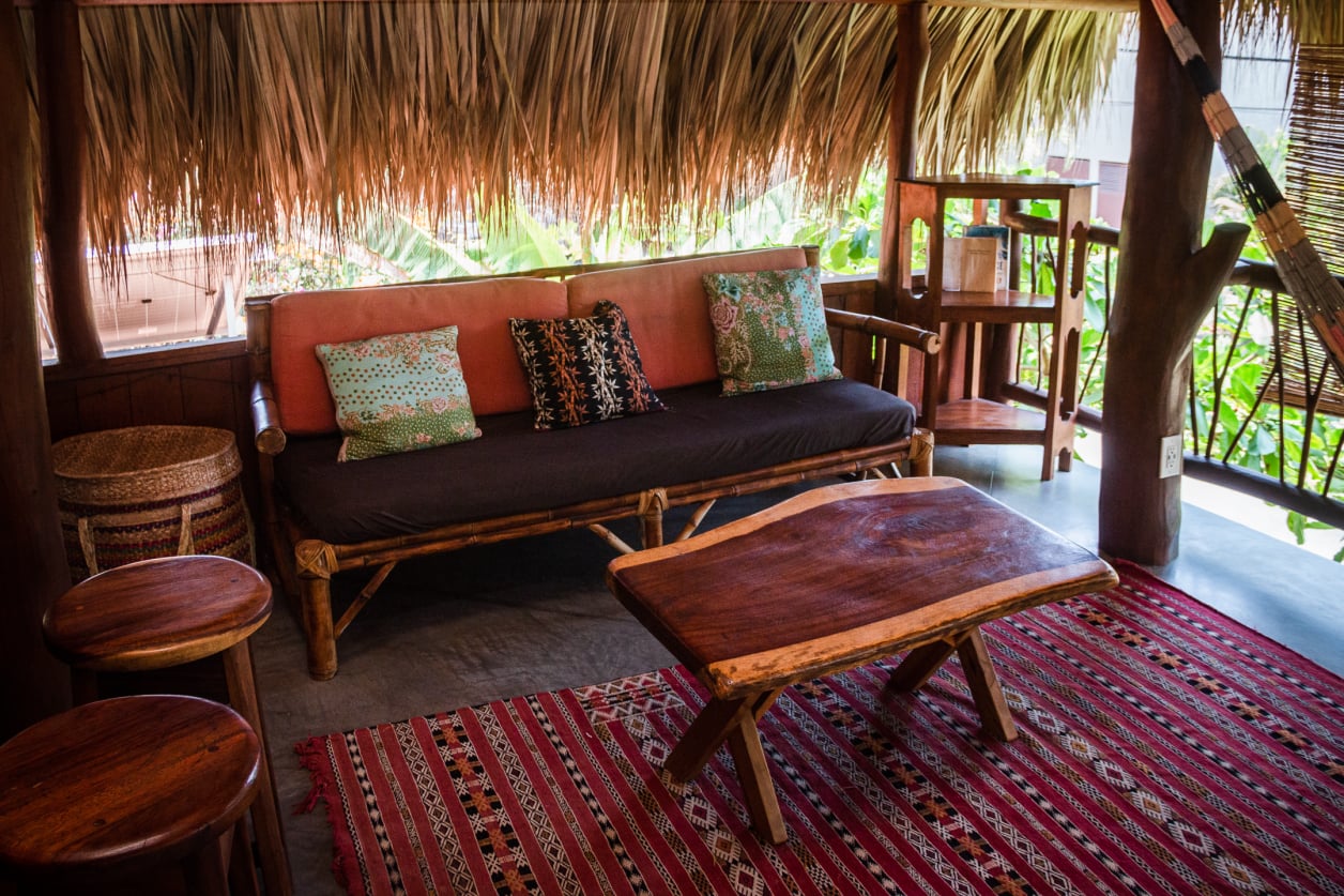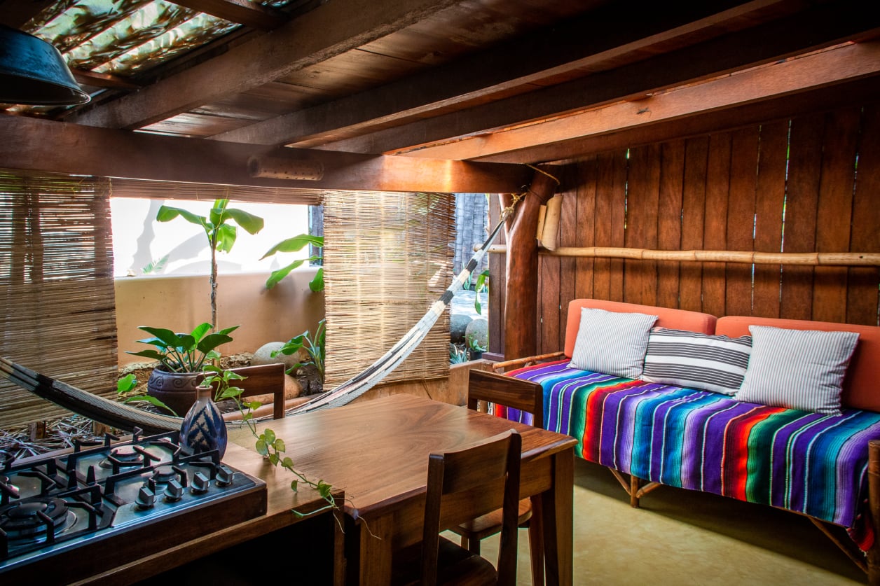 King size bed in AC room with en-suite. Outdoor open plan living room and fully equipped kitchen. There is also a single hanging bed in the living room and a hammock.